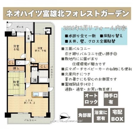 ■2026年2月室内リフォーム済!!(水廻り一新・クロス・床貼替など)■三面バルコニー!北東角部屋■敷地内に公園有■富雄駅徒歩14分■オートロック■宅配BOX有